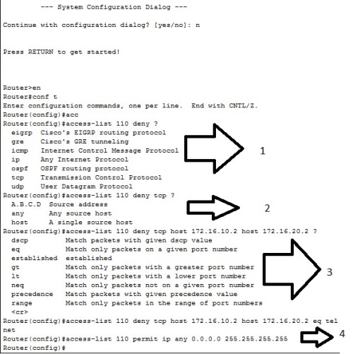 - access-list 110 deny //karena kita mo blok telnet (biar ga di isengin routernya) so..kita ga bisa pake standar ACL (singkatan dari akses list) yang cuma bisa blok IP doank..so kita pake nomor 100 keatas…dalam kasus ini gw pake 110…terserah si lo mo angka berapa aja