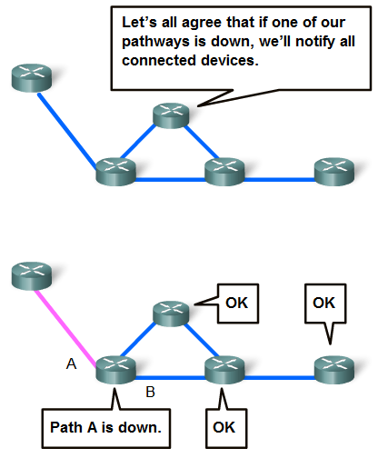 Proses dari tiap alat2 jaringan dalam men-share informasi tentang pathways (route tempuh packet) dengan jaringan lain