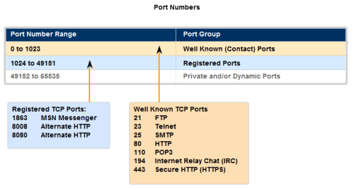 - Well Known Port (port 0 sampai 1023), yaitu port2 yang biasa dipakai dalam transfer data sehari2 seperti e-mail port, chat port, web browser port, dll