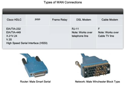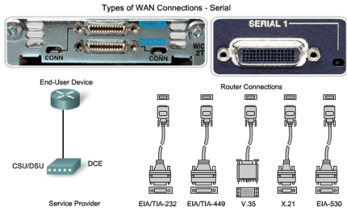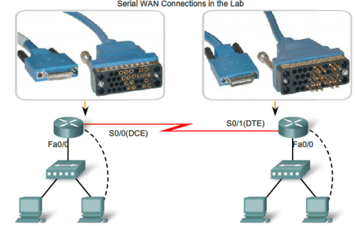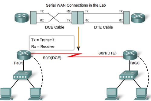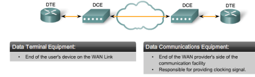 DCEs and DTEs are used in WAN connections. The communication via a WAN connection is maintained by providing a clock rate that is acceptable to both the sending and the receiving device. In most cases, the telco or ISP provides the clocking service that synchronizes the transmitted signal.