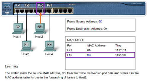 The source device sends the data through the network. Each NIC in the network views the information to see if the MAC address matches its physical address. If there is no match, the device discards the frame. When the frame reaches the destination where the MAC of the NIC matches the destination MAC of the frame, the NIC passes the frame up the OSI layers, where the decapsulation process take place.