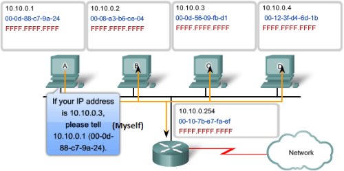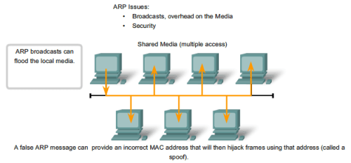 As a broadcast frame, an ARP request is received and processed by every device on the local network. On a typical business network, these broadcasts would probably have minimal impact on network performance. However, if a large number of devices were to be powered up and all start accessing network services at the same time, there could be some reduction in performance for a short period of time. For example, if all students in a lab logged into classroom computers and attempted to access the Internet at the same time, there could be delays. (Overhead on the Media)