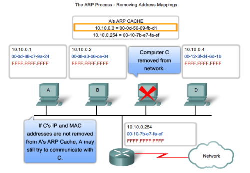 In some cases, the use of ARP can lead to a potential security risk. ARP spoofing, or ARP poisoning, is a technique used by an attacker to inject the wrong MAC address association into a network by issuing fake ARP requests. An attacker forges the MAC address of a device and then frames can be sent to the wrong destination. (Security)