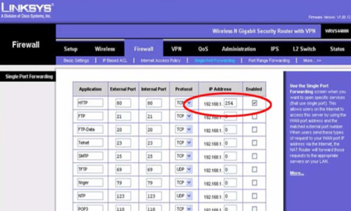 For example, in the figure, HTTP service requests coming into this Linksys is now forwarded to the web server with the inside local address of 192.168.1.254.