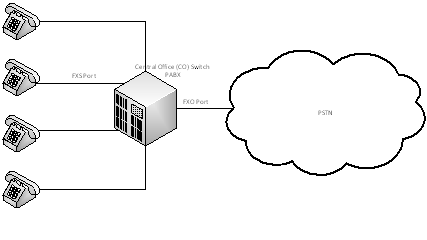 Foreign eXchange Office (FXO) Port = port RJ-11 dan/ato RJ-45 untuk konek dari CO ke CO, PABX ke PABX, dan IP Phone ke Router (mirip kek Ethernet Cross-over cable konsep nya)