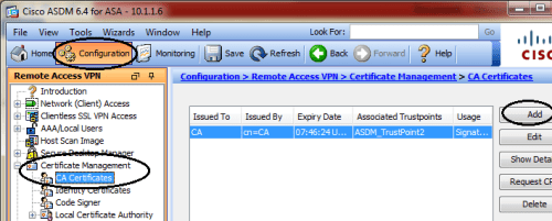 Go to Configuration > Certificate Management > CA Certificates > click add