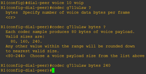 - Klo kita Cuma ketik codec g711 <enter>, default voice payload-nya (bytes per frame) 160 bytes