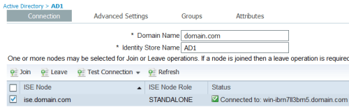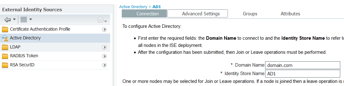 Klik Active Directory -> input domain name (nama ActiveDir server lo, gw pake “domain.com”) dan Identity Store Name-nya (nama alias buat dijadiin referensi ISE-nya)