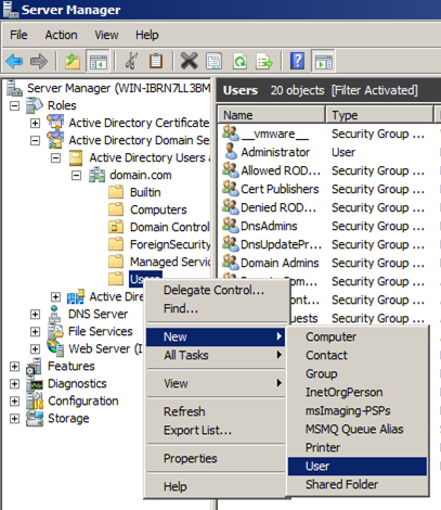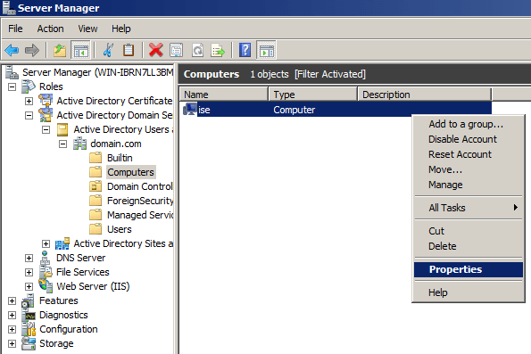 Yuk kita cek di Server ActiveDir-nya…masuk ke Server Manager -> Roles -> Active Directory Users -> [nama domain lu] -> Computers, disitu ada server ISE kita