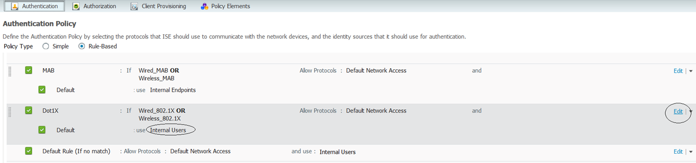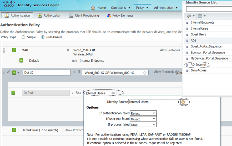 Pastikan AD urutan pertama, baru Internal Users…soalnya ISE nge-cek nya sequential..berurutan (bisa dirubah kok urutannya)
