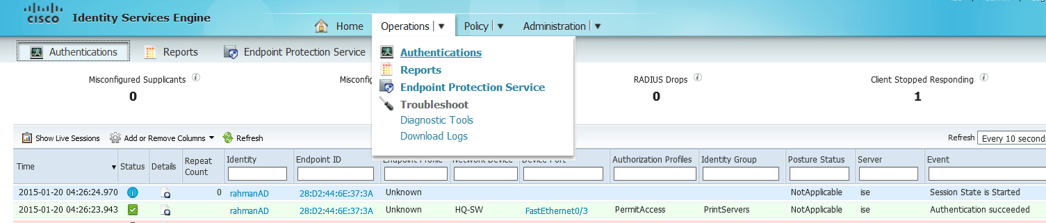 Sudah??? Itu aja?? Ya jelas belum…default-nya ISE kan pake Internal User, skrg kita arahin klo mau authentikasi ya pake ActiveDir…klo ActiveDir-nya fail/ga bisa di akses baru pake Internal (Sequences)