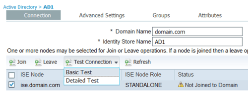 Kalau sudah…nanti ada tulisan bahwa status ISE-nya “not joined to domain”, nyok di test dulu…pilih basic test aja