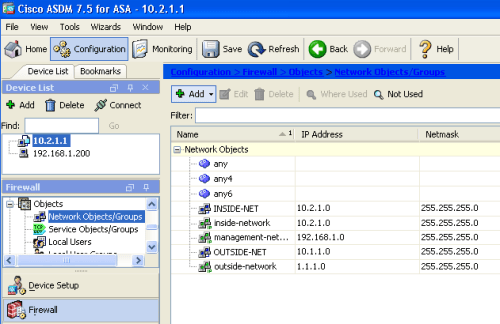 On Configuration (next to Home icon) > Firewall > Objects > Network Objects/Groups > add