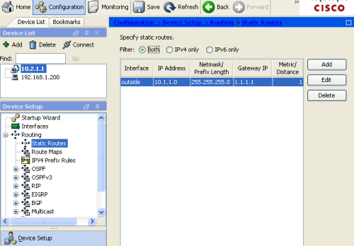 Versi CLI-nya:”route outside 10.1.1.0 255.255.255.0 1.1.1.1” (pendek ya, daripada klak klik ga jelas, that’s why I know some people prefer the “old fashioned way”)