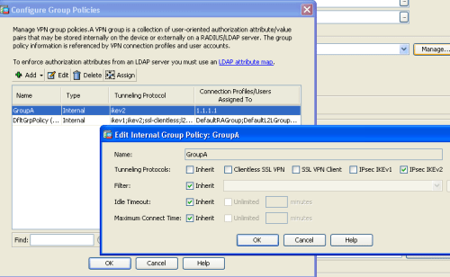 Trus configure group policy-nya…klo mau konek ke peer 1.1.1.1 pake tunnel apa (ikev1/ikev2)
