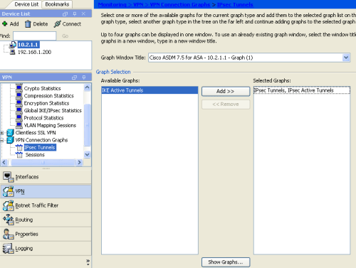 On ASA…masuk ke Monitoring > VPN > VPN Connection Graphs > IPsec Tunnels (atau sessions juga bisa)